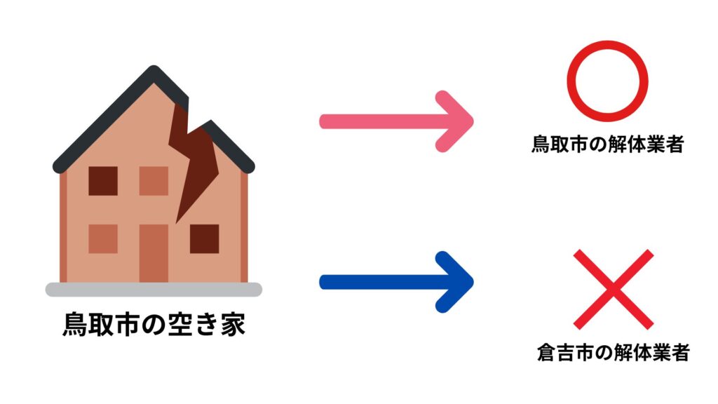 見落としがちなのが、同じ鳥取県でも、建物が立っている住所と同じ市区町村に所属する解体業者が施工しないと補助金の対象となりません。
